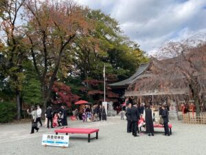 社務所前の松竹梅や境内にある我々では手の行き届かない樹木の枝などを剪定する大変な作業を一日かけて行っていただきました。