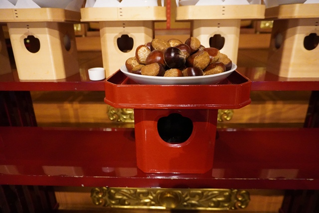 本日、ご厚志により採れたばかりの栗のご奉納をいただきました。早速平瓦に載せて御神前へお供えしております。