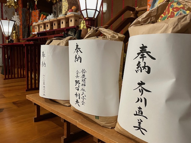 当神社でも御厚志により新米の御奉納をいただき、早速御神前へ上げさせていただきました。抱きかかえると微かに新穀のこうばしい香りが漂います。