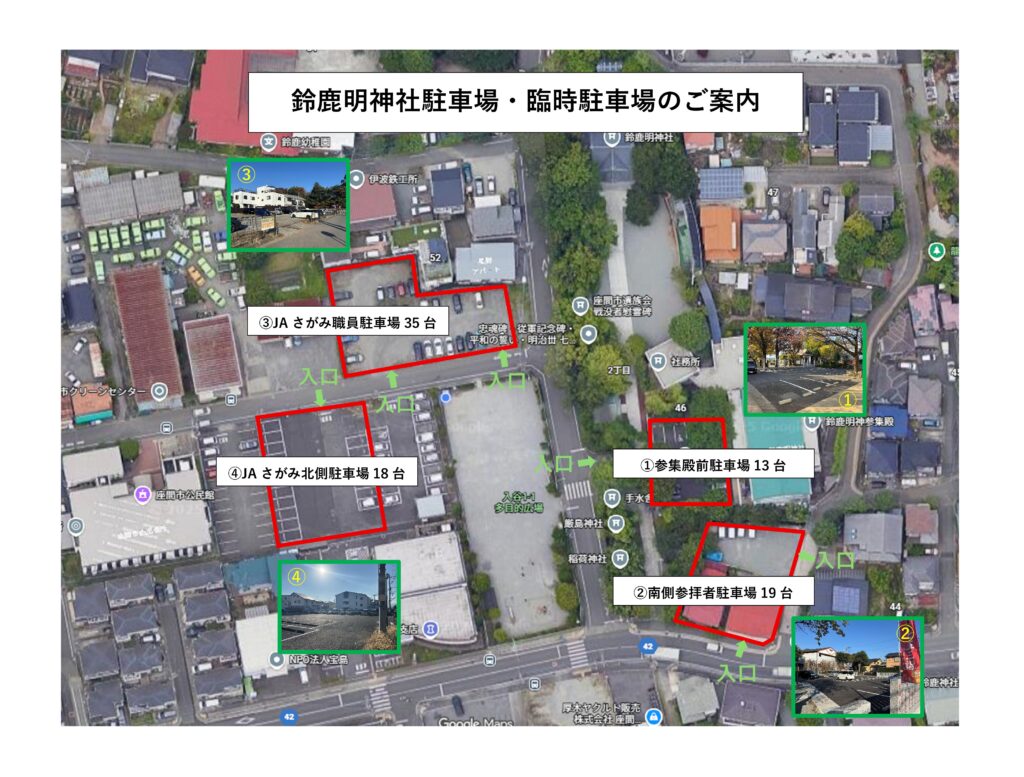 ①神社参集殿前駐車場 13台分+身障者用駐車場1台分