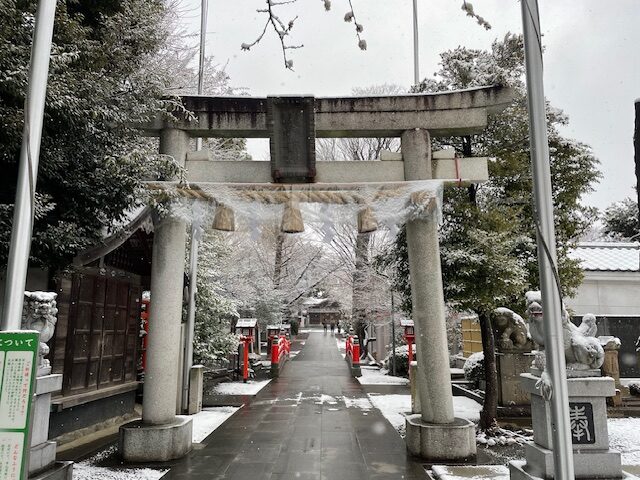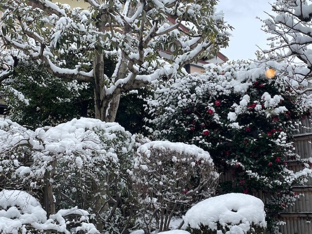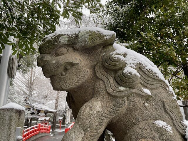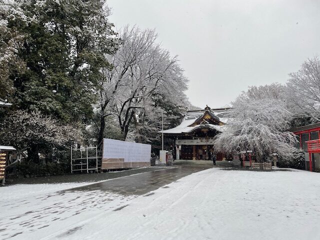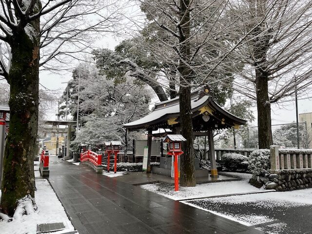 昨日は大事にならず安堵していた雪ですが、思った以上に降っていたようで夜が明けると境内は真っ白な雪景色となっていました。