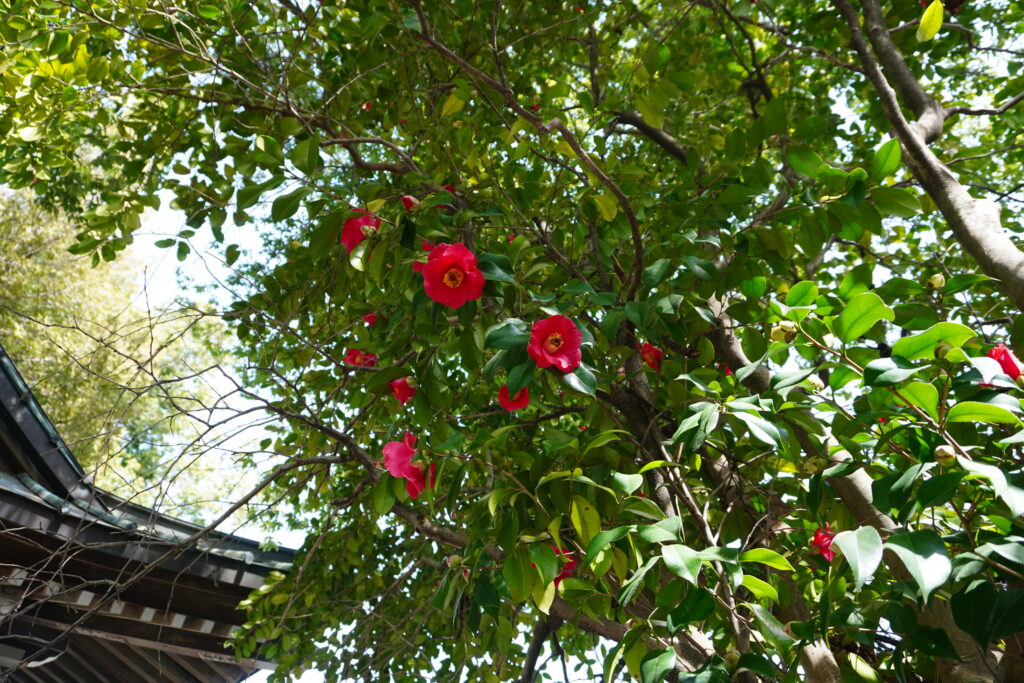 この暖かさでスギ花粉も大量に飛散しているようですが、境内では椿があちらこちらで咲いています。