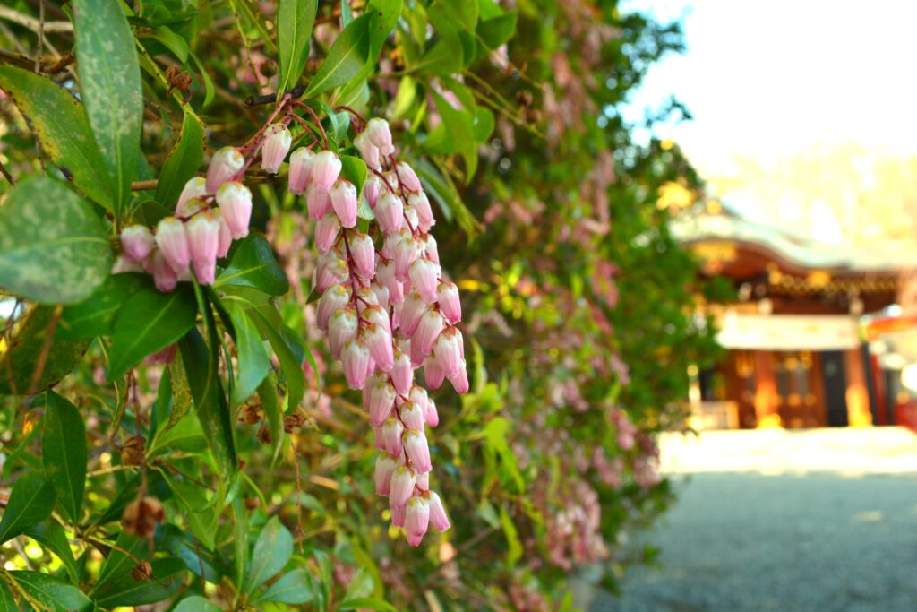 現在、本殿前境内西側の馬酔木(あせび)が花をつけております。