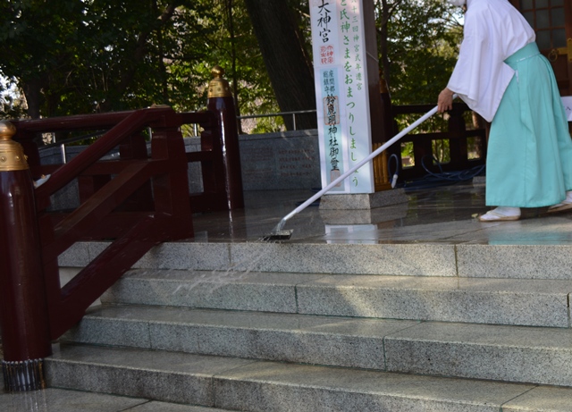 本殿前は屋根で雨も当たらない場所が多いため、本日午後に床の水洗いを行いました。