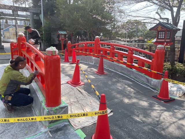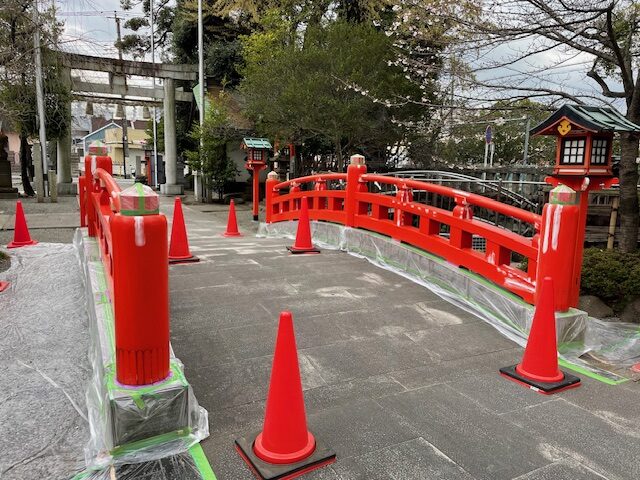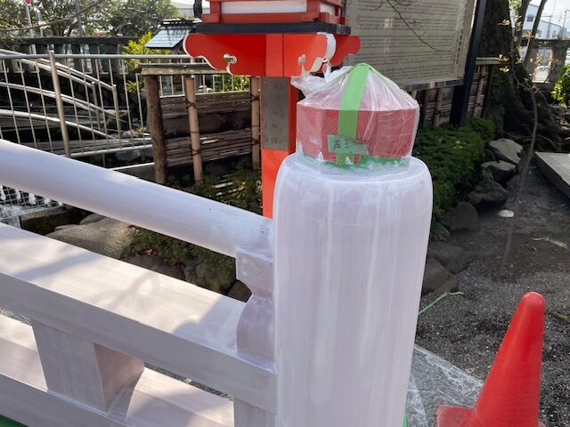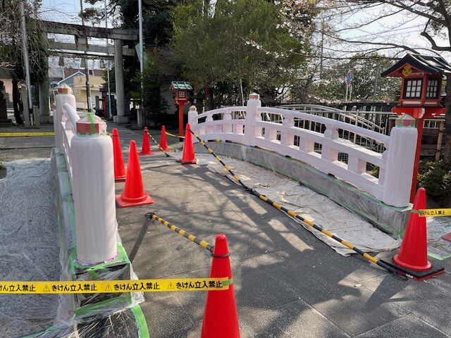 しばらく通路が狭まったりなどご参拝の方にはご迷惑をお掛けしましたが、先の週末を以て境内太鼓橋欄干の修繕作業が無事終了しました。