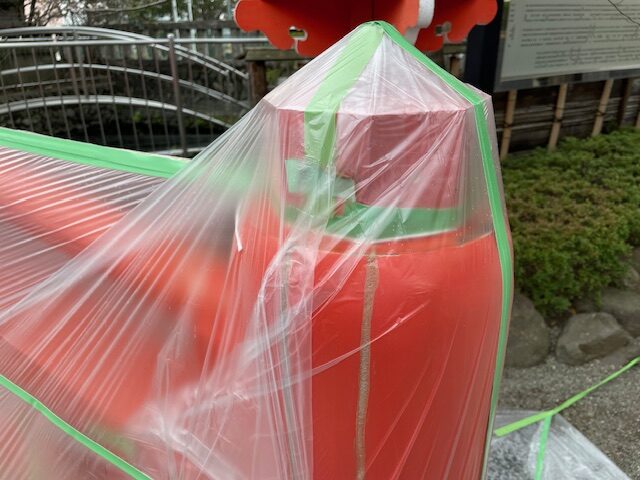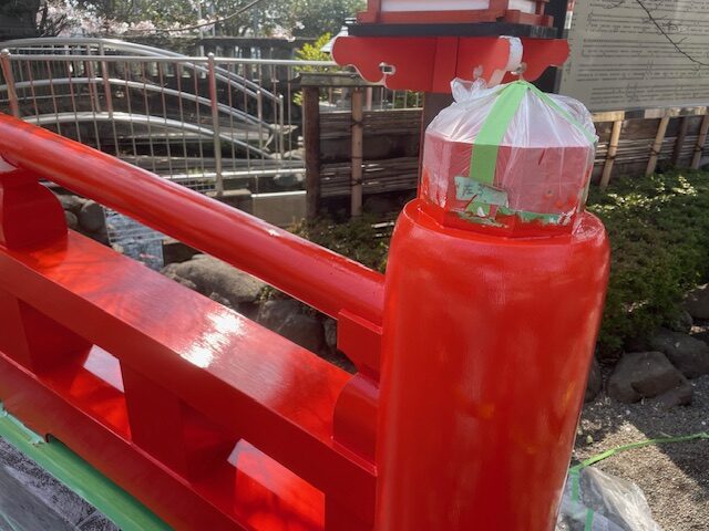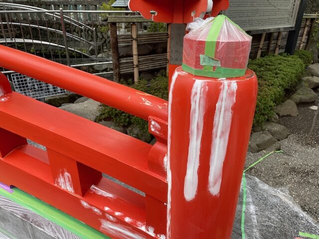 大掛かりな作業になるとはお聞きしておりましたが、傷んだところの修繕に加え下塗りが2回、上塗りが6回に及んだとの事。お陰様で建てたばかりのような、鮮やかな色彩の太鼓橋へと生まれ変わりました。雨が降る中でもギリギリまで作業を続けられた職人の皆様方には心より感謝申し上げます。