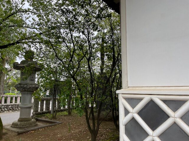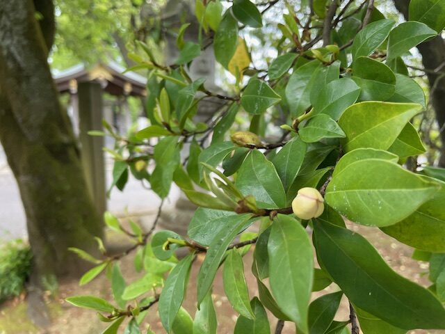 落ち葉や落ち枝に気を遣う日ではありますが、社務所に戻ると微かに果物のような甘い香りを感じます。参道を挟んだ神輿殿横のカラタネオガタマの花の香りです。